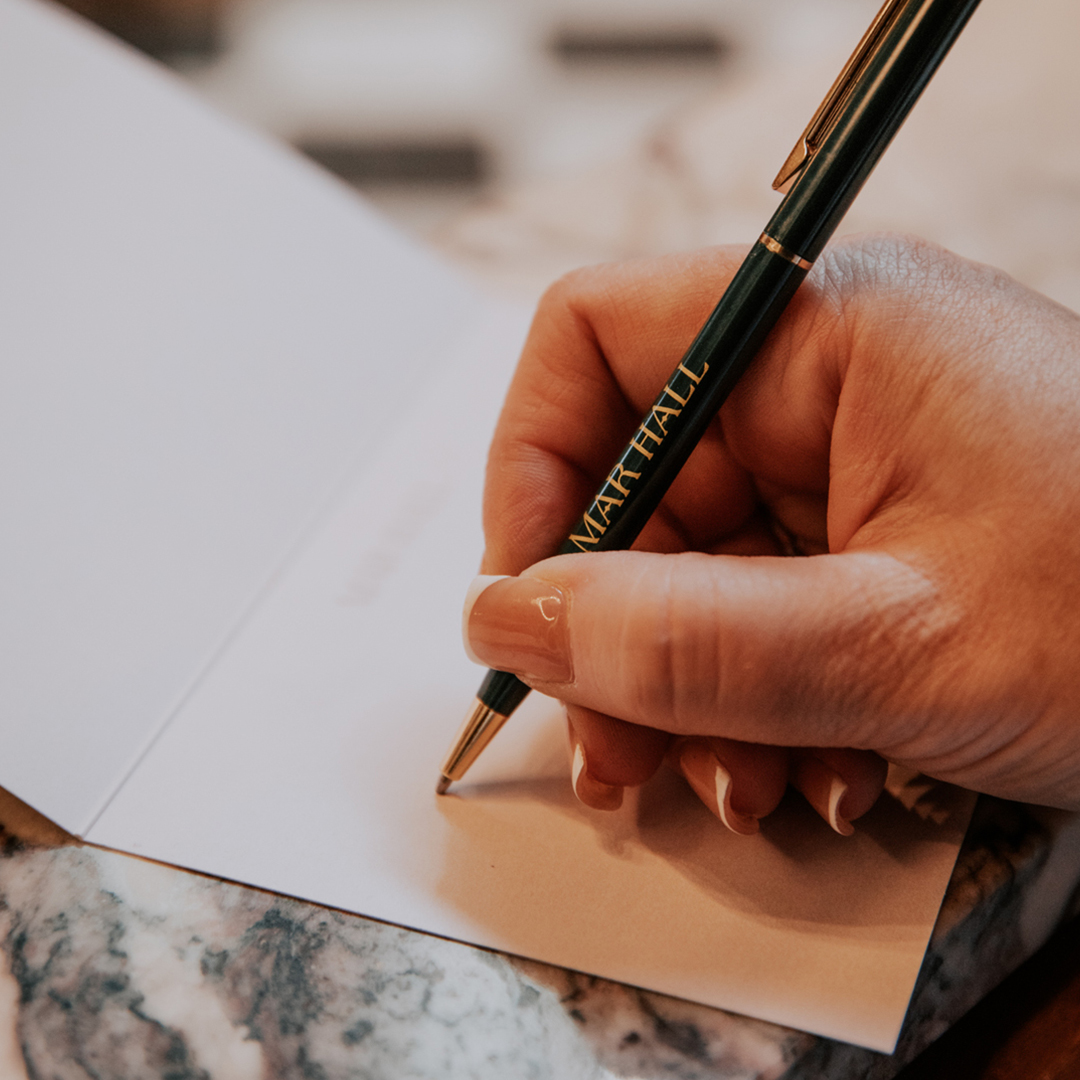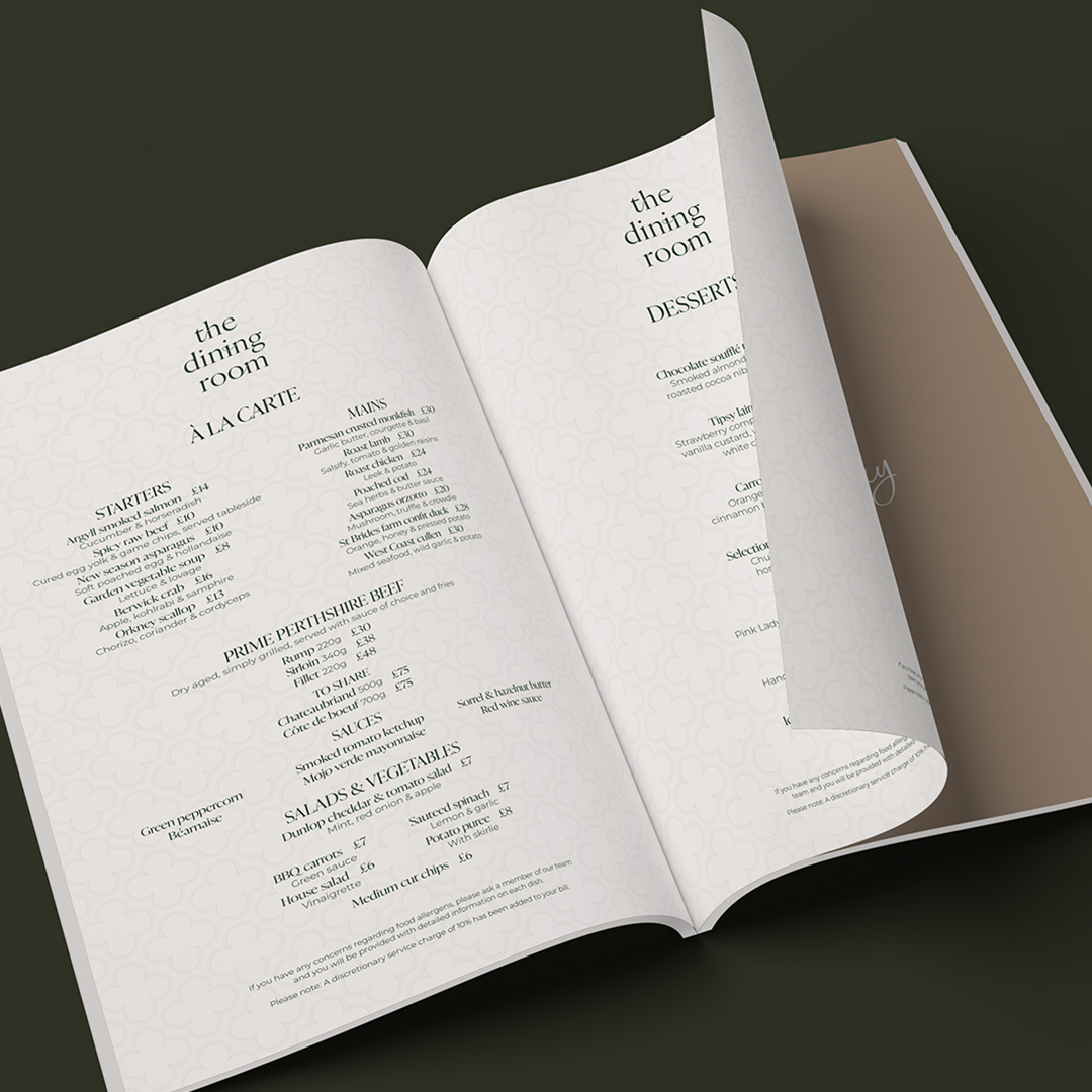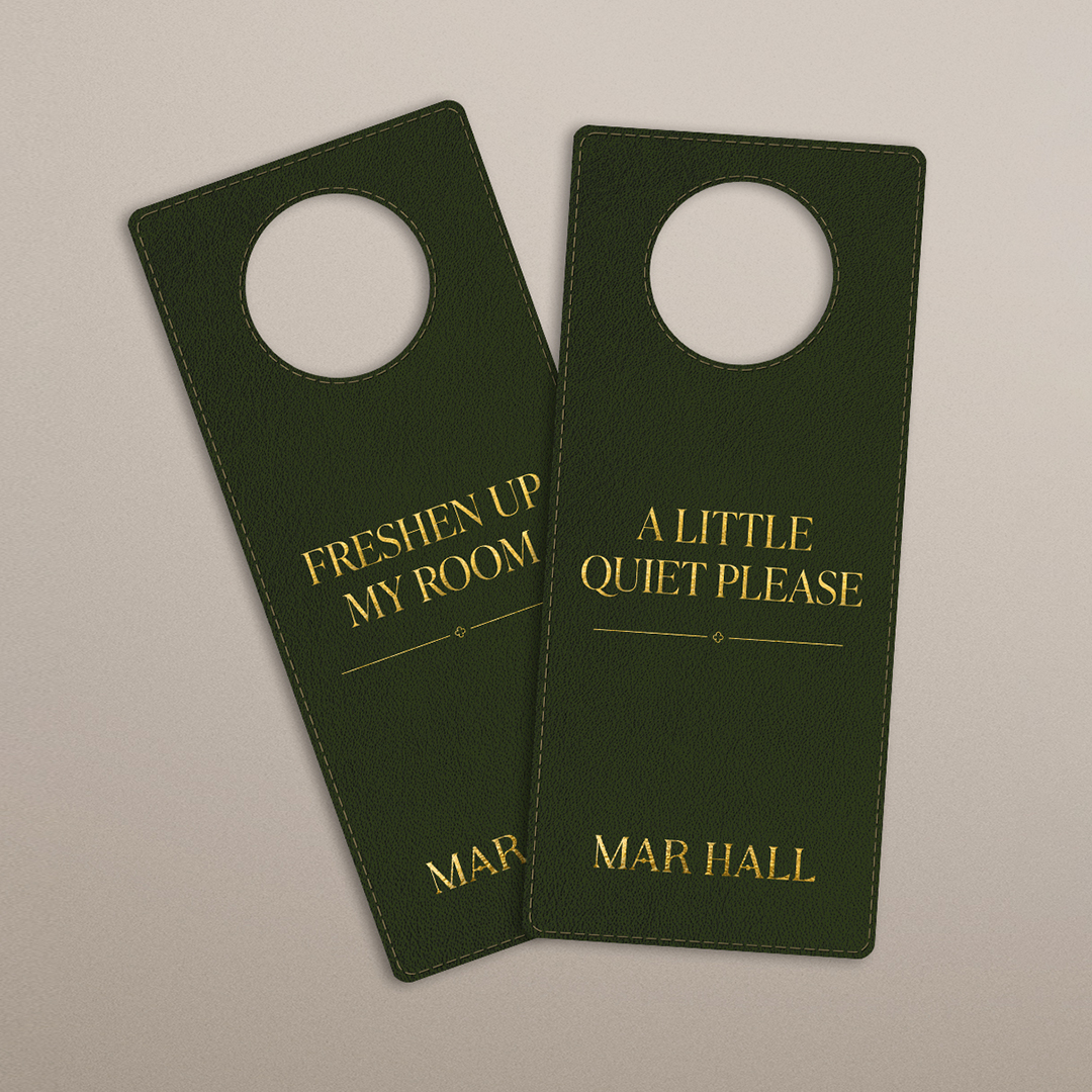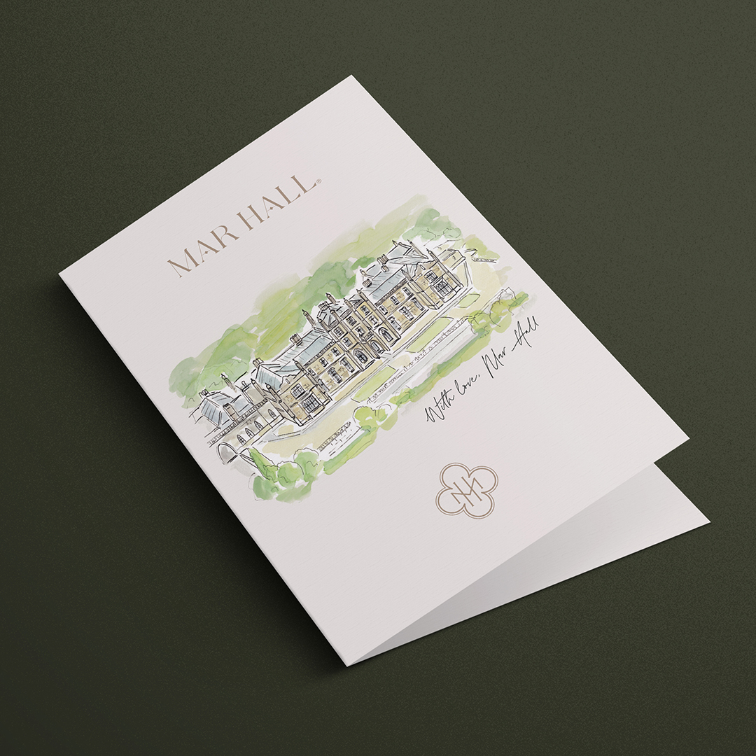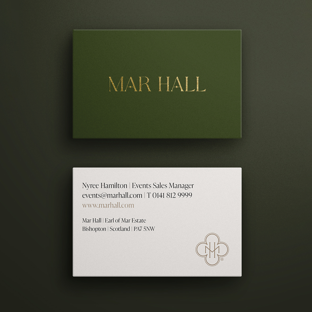 The colour palette is inspired by nature and the epic Scottish landscape that surrounds the estate. A natural palette was vital in affirming Mar Hall as a soulful escape. Green signifies renewal in the natural world, but also carries a sense of heritage, luxury and timeless elegance. Fawn has warm, calming qualities which perfectly reflect the peace and tranquillity to be found within the resort. The ivory has been introduced as an organic neutral to complement both the green and fawn. Gold foil not only injects an energy that aligns perfectly with the hall’s contemporary interiors but also brings with it an affirmation of the magnificence that defines a stay at Mar Hall. The typography once again celebrates past and present, combining the timeless serif font Ivy Presto with the modern sans serif Montserrat.
